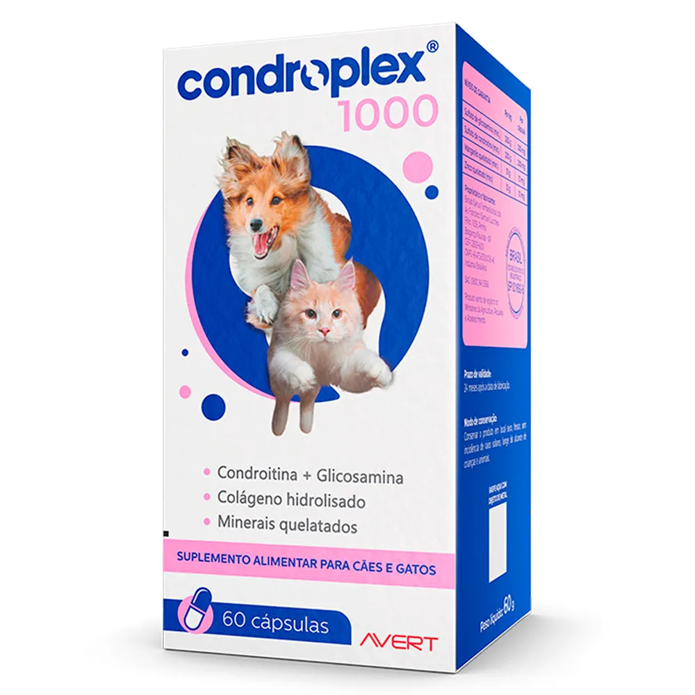 CondroPlex 1000 cápsulas é um suplemento nutricional composto por nutrientes essenciais às articulações: Colágeno Hidrolisado, sulfato de condroitina A, sulfato de glicosamina e minerais quelatados (Zn, Cu, Mn).