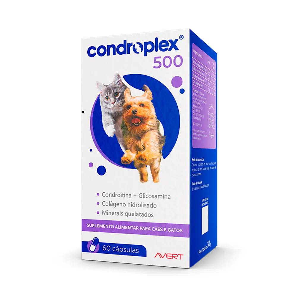 Indicação de uso:Condroplex 500 cápsulas é um suplemento alimentar composto por nutrientes essenciais às articulações, indicado para gatos e cães de pequeno porte em qualquer idade.