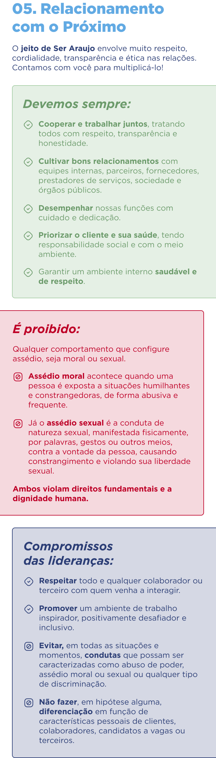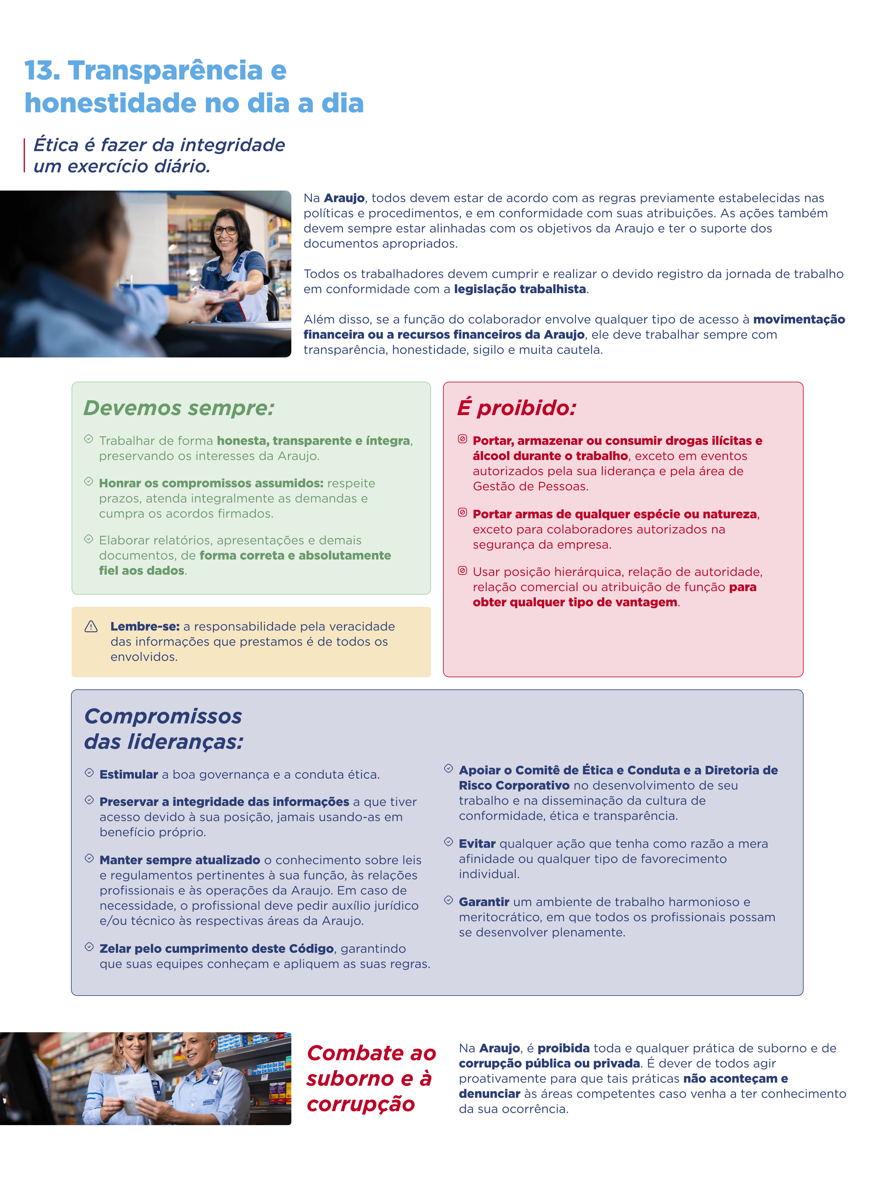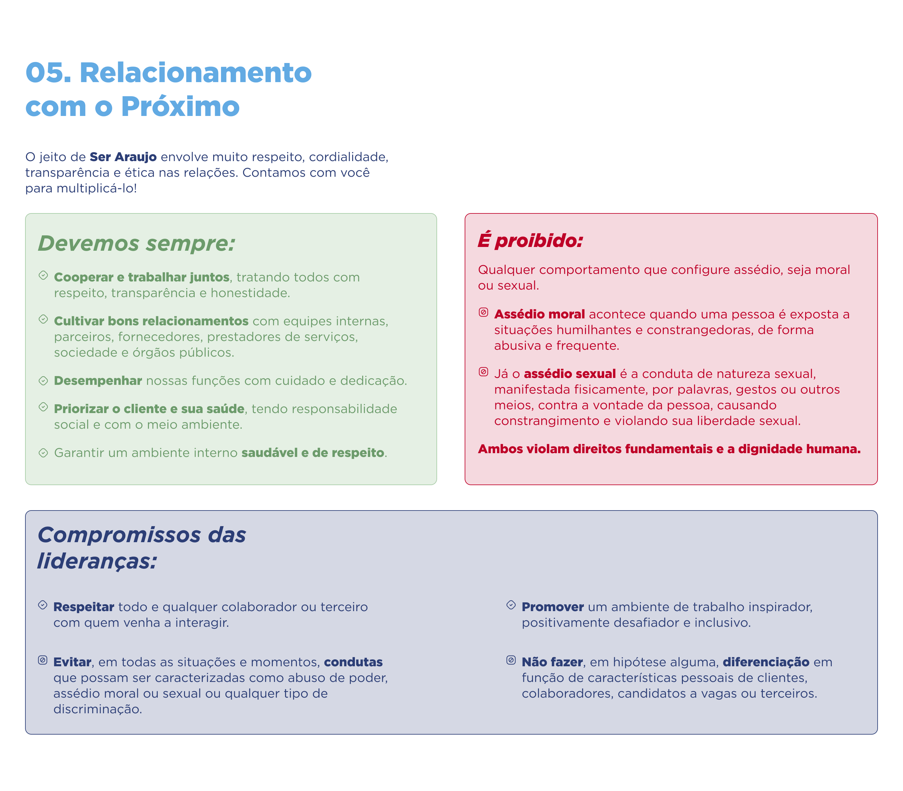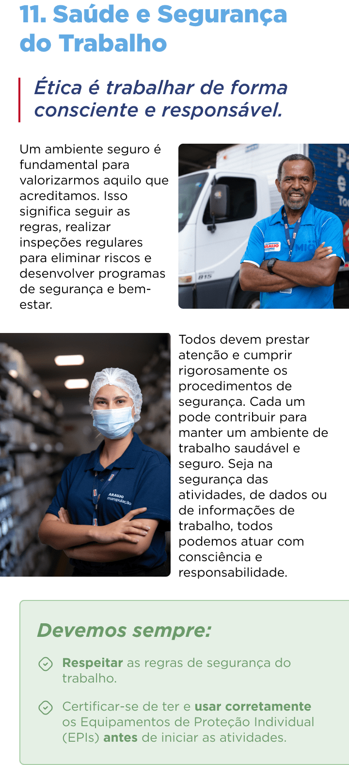 Os princípios e orientações do Código de Ética e Conduta são um verdadeiro guia para Ser Araujo – no cotidiano do trabalho, na dinâmica das relações e na vontade de estar, cada vez mais, próximos.