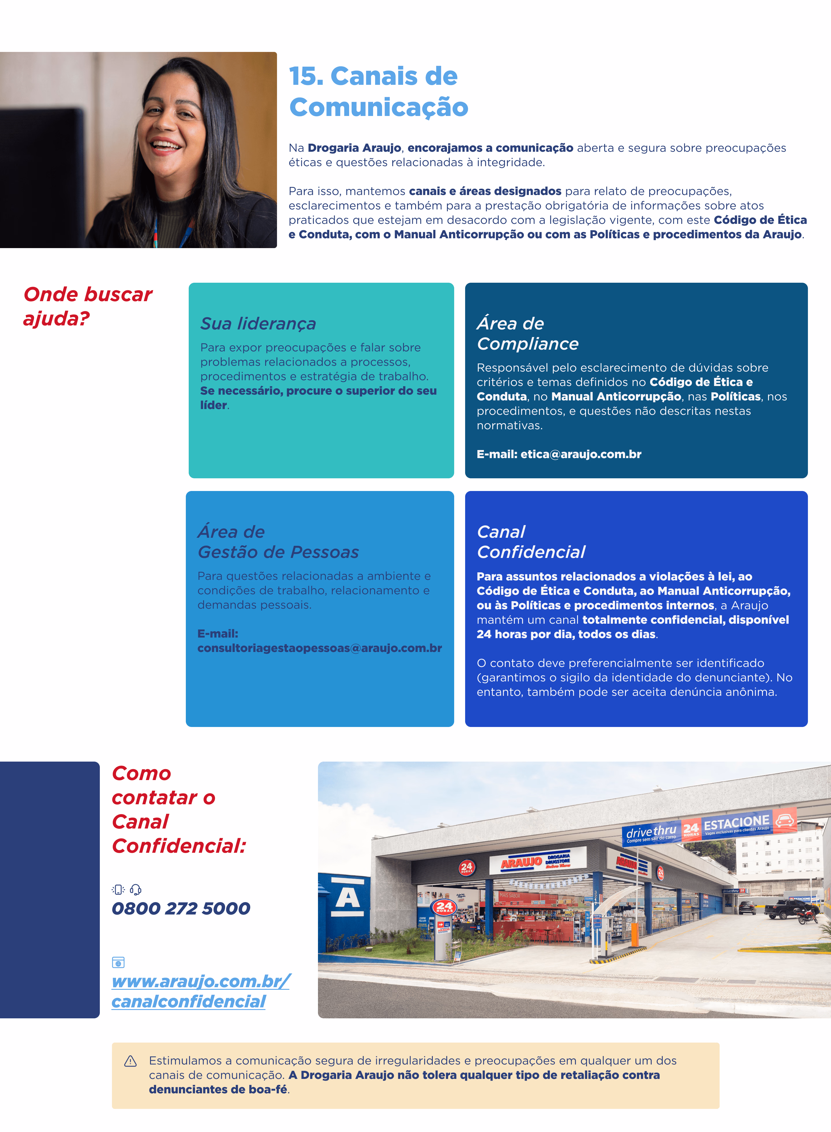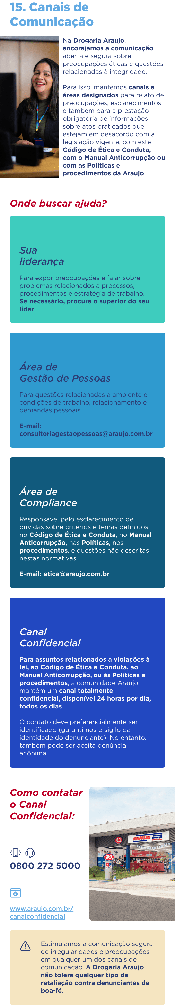 Se você perceber algo que não está de acordo com nossos valores éticos ou com as leis vigentes, é importante reportar imediatamente à Araujo. A empresa valoriza a transparência e deseja saber sobre qualquer problema. Você pode usar o Canal Confidencial, uma plataforma externa, especializada, independente e que garante sigilo e confiabilidade ao processo de apuração de denúncias e relatos.