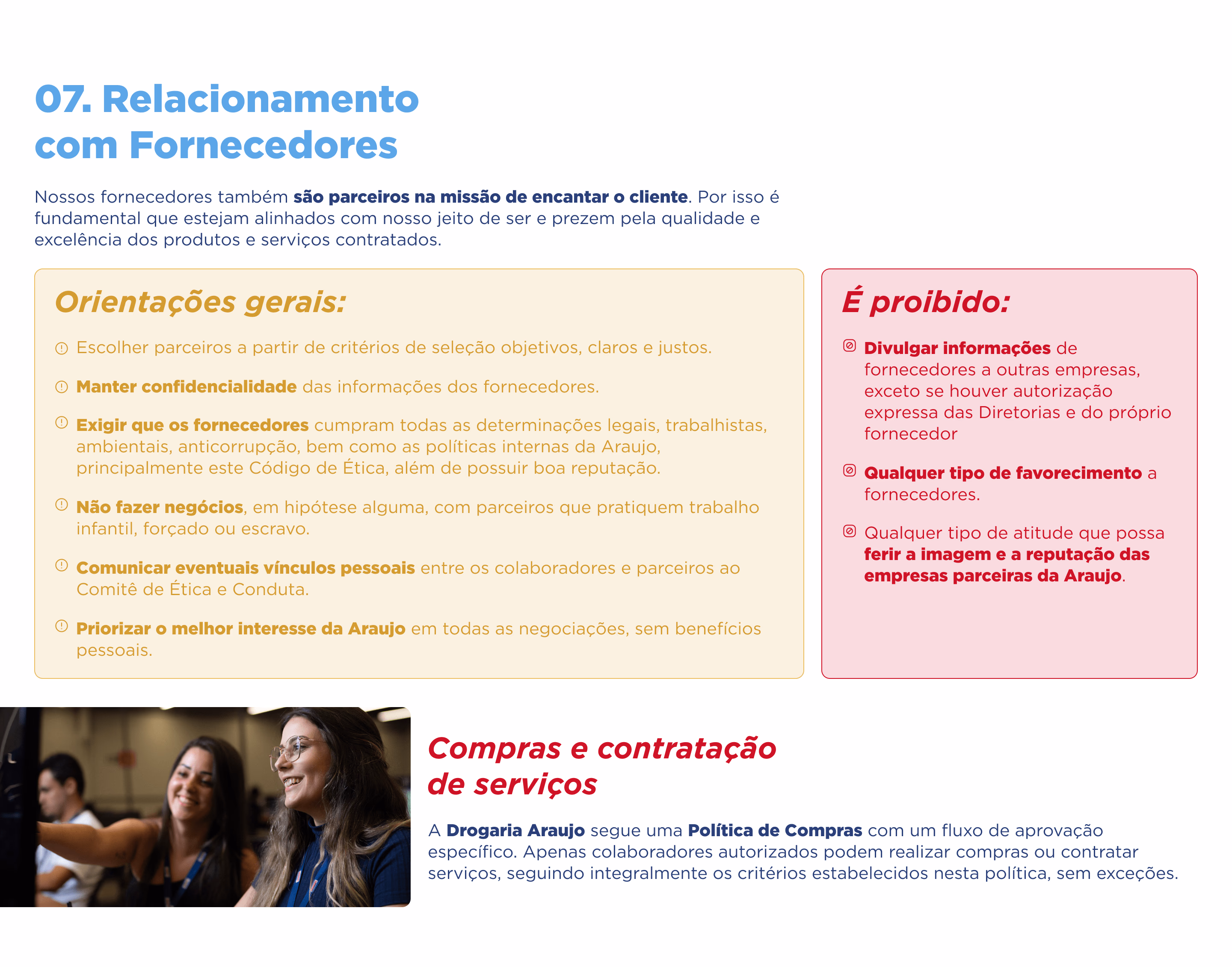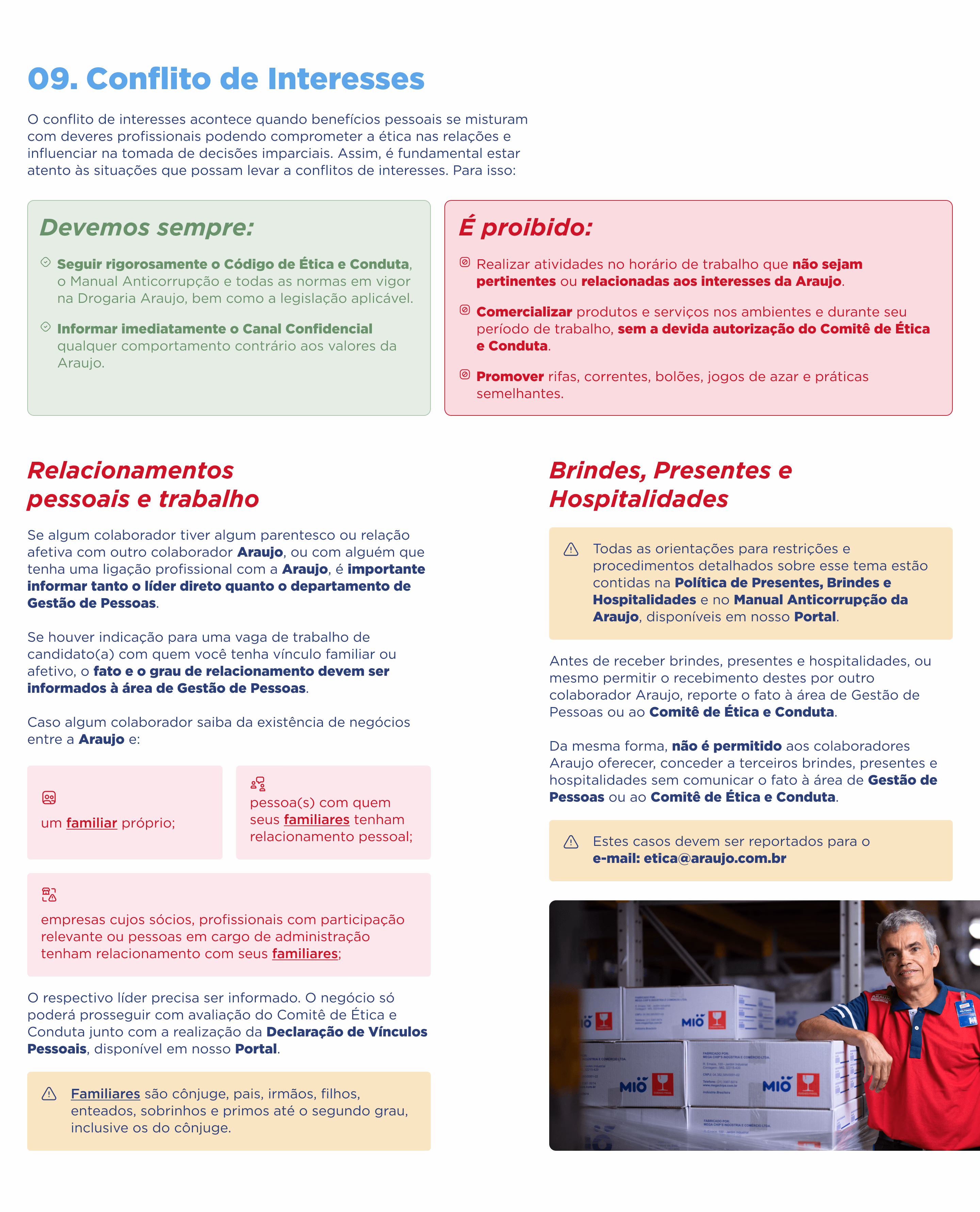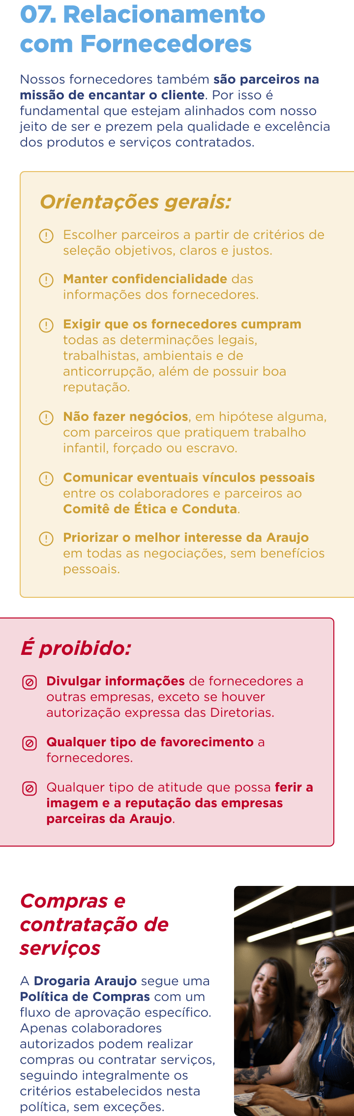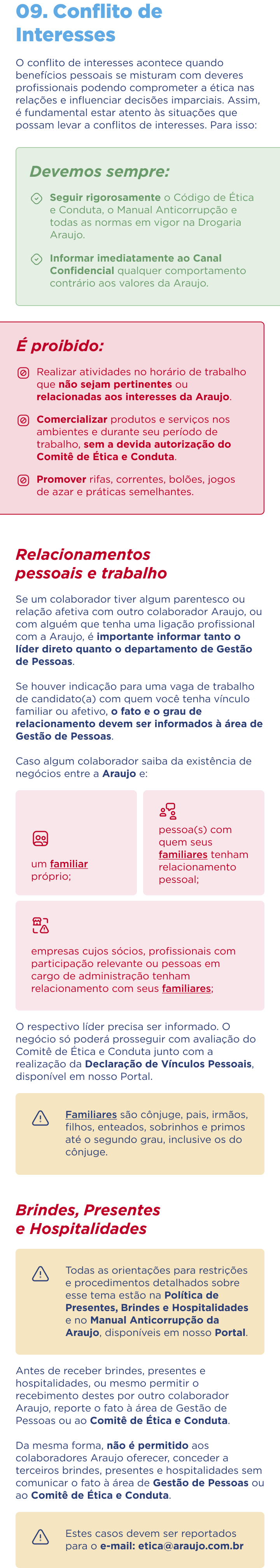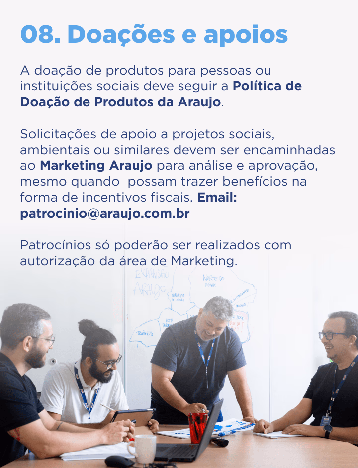 O Código de Ética e Conduta entra em vigor assim que é aprovado e divulgado pela Presidência da empresa, e é parte integrante de todos os contratos assinados pela Araujo.