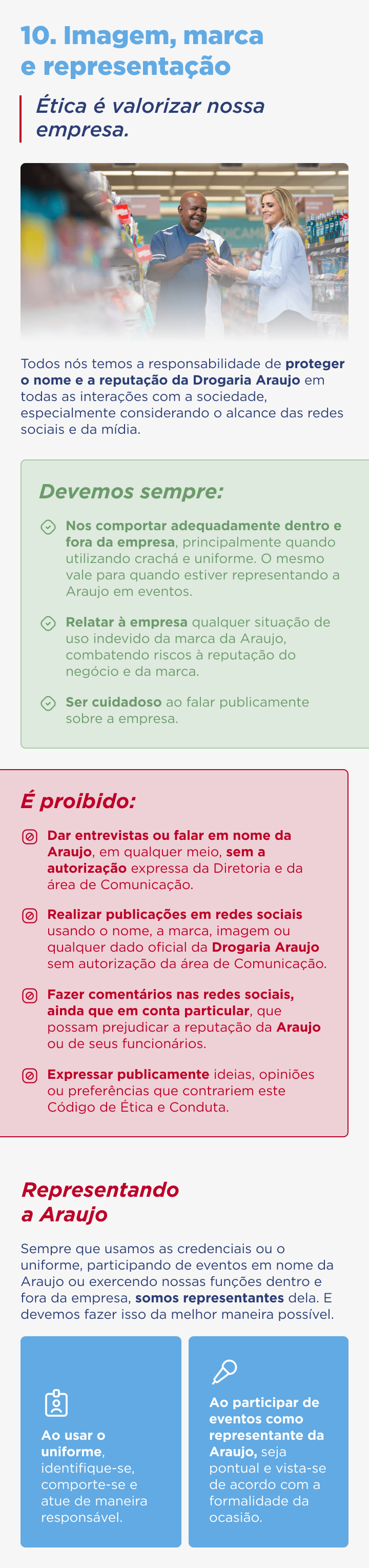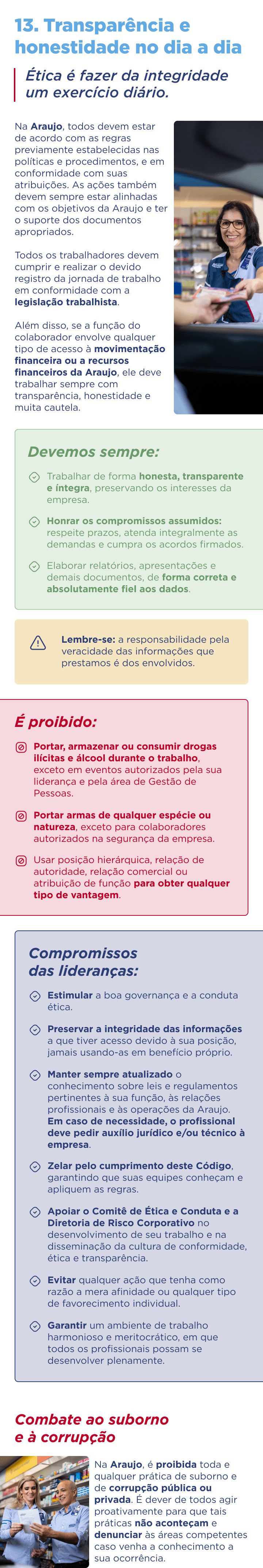 Este Código de Ética e Conduta é um dos principais documentos do Programa de Integridade da Araujo. Ele é profundamente alinhado à nossa cultura e, afinal, todos somos responsáveis pelas relações no nosso dia a dia – com colegas, superiores, subordinados, fornecedores, parceiros, instituições, empresas, comunidade e, claro, clientes.