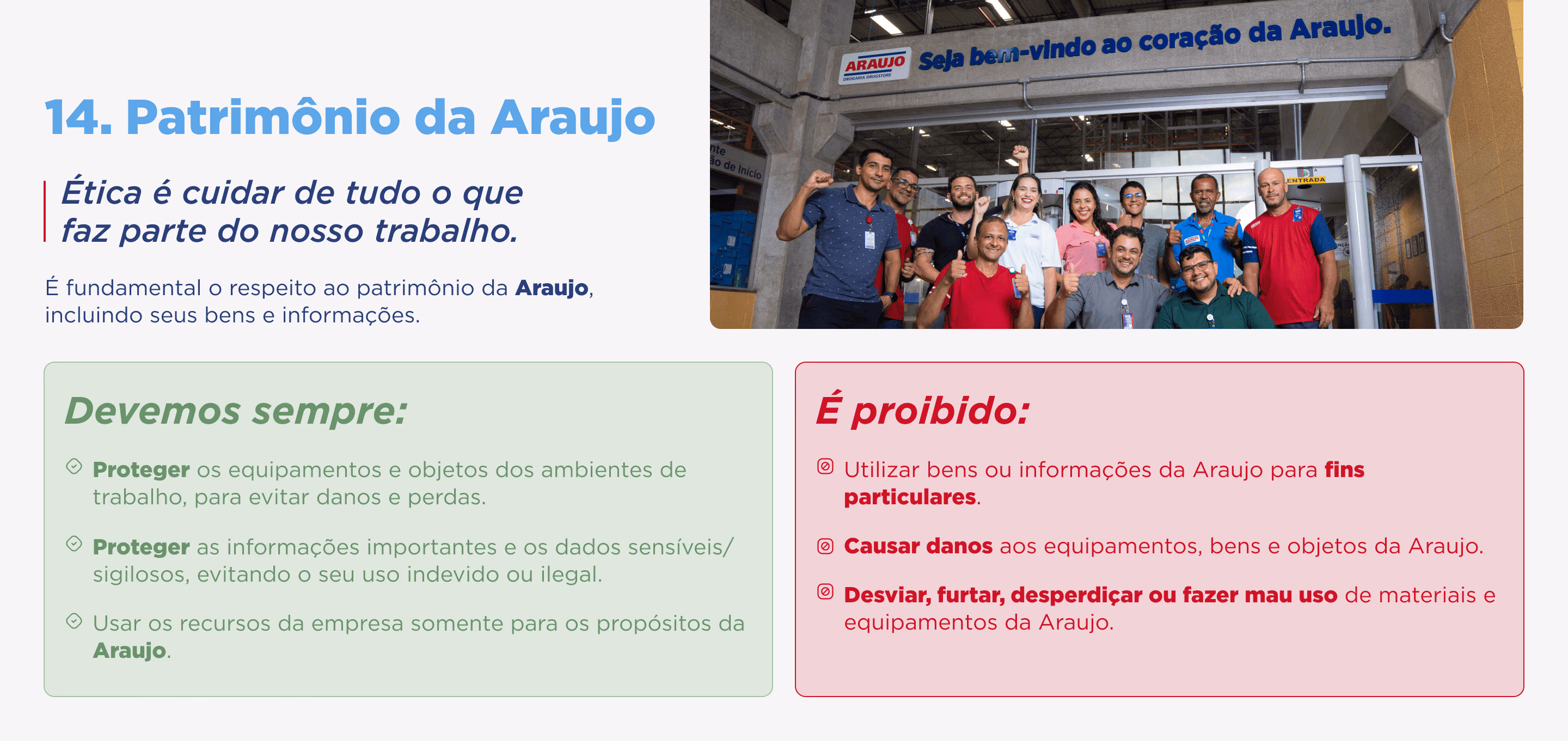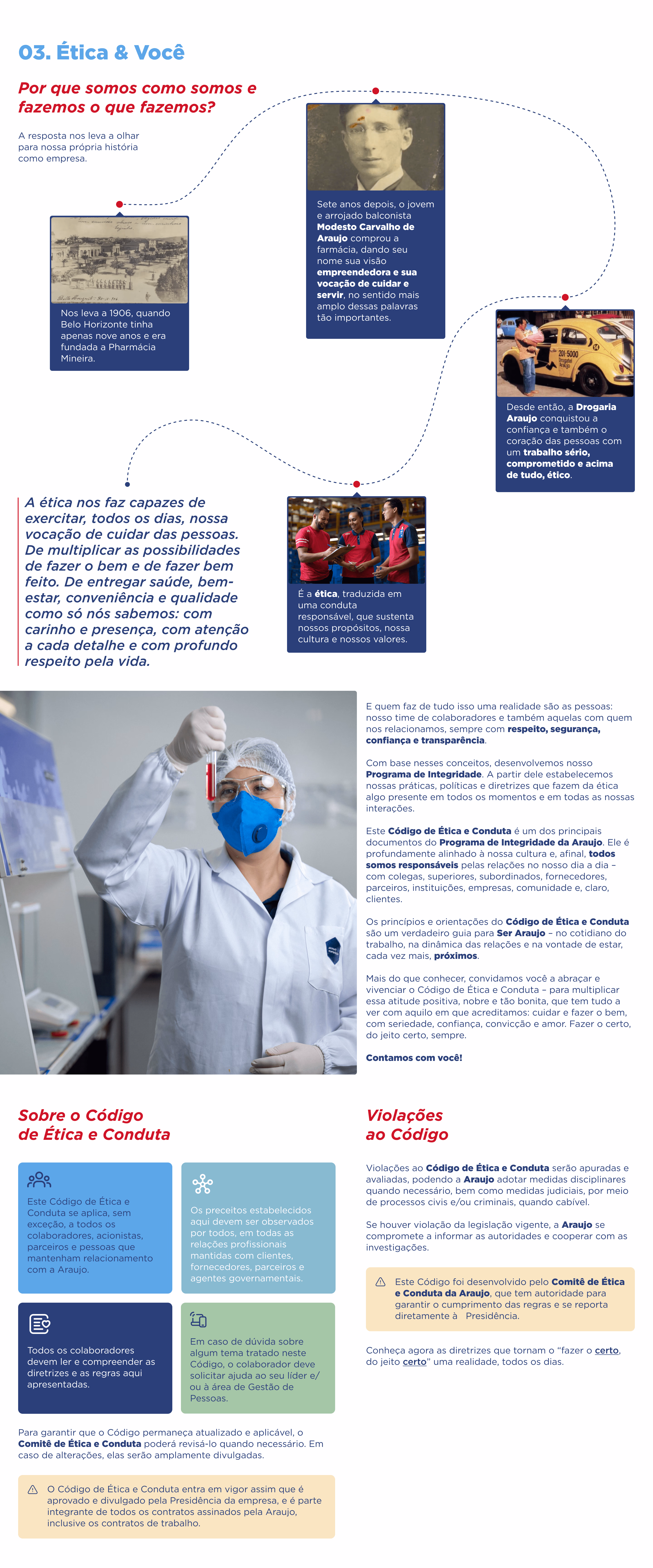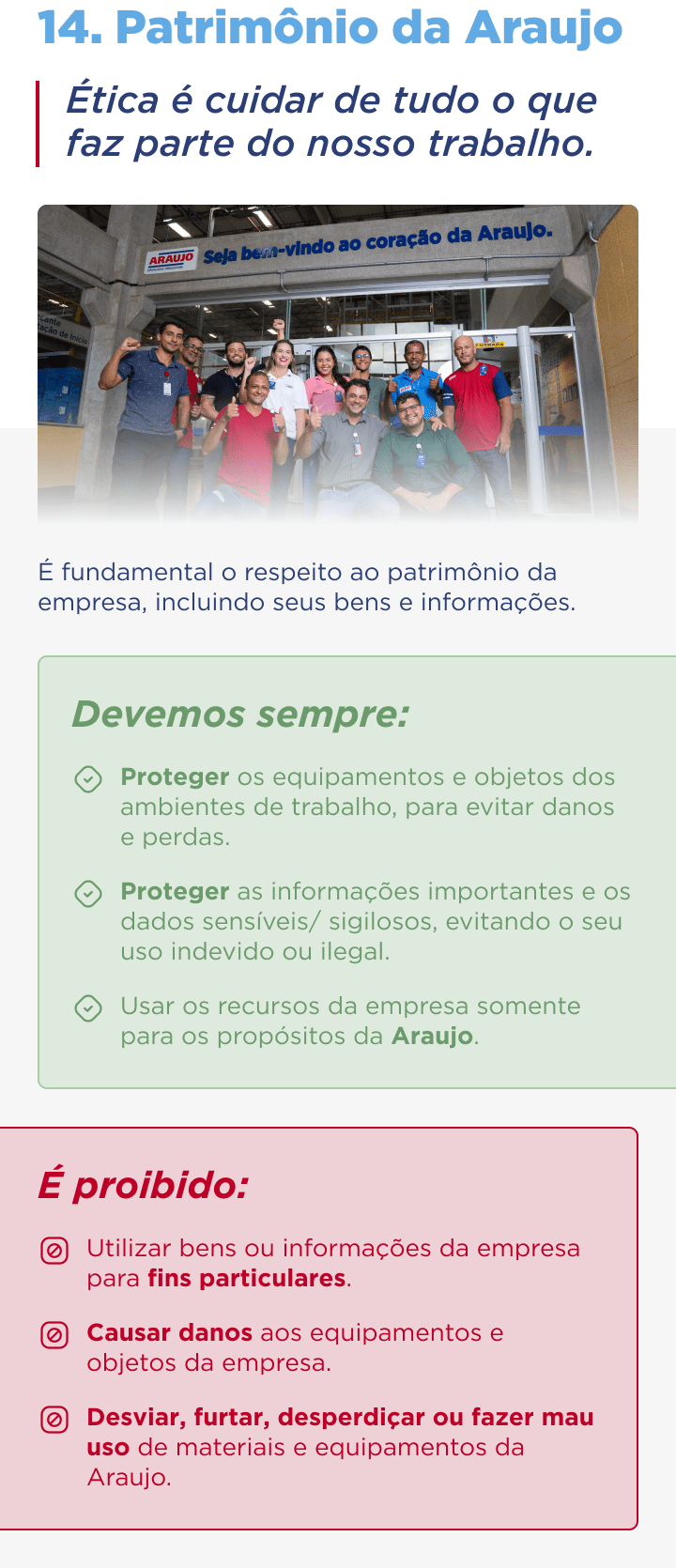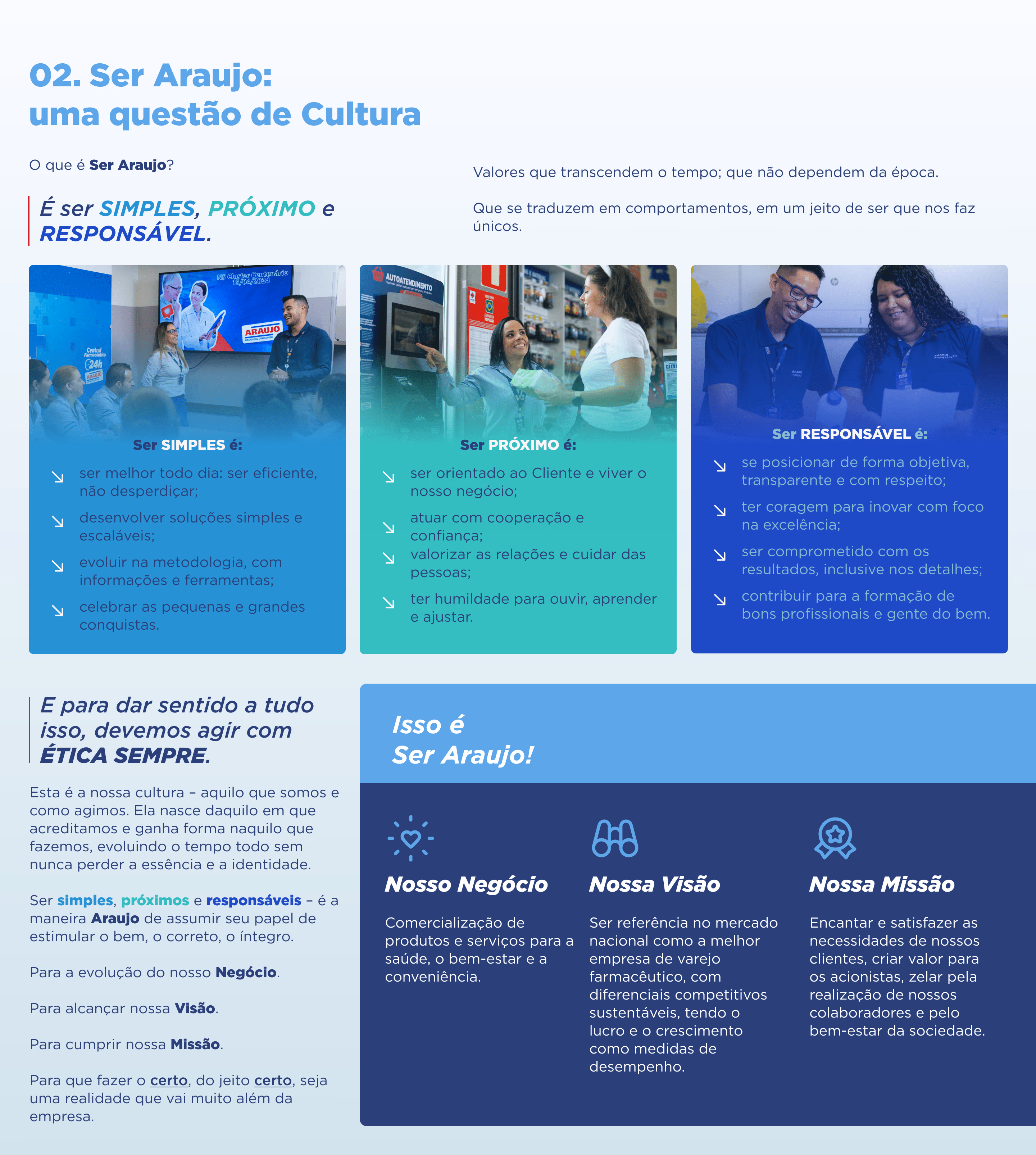 Este Código de Ética e Conduta nasce e evolui continuamente como resultado da reflexão de que somos feitos de pessoas e que a maneira de trabalhar e agir de cada um faz da Araujo a empresa que somos e que queremos ser, todos os dias.