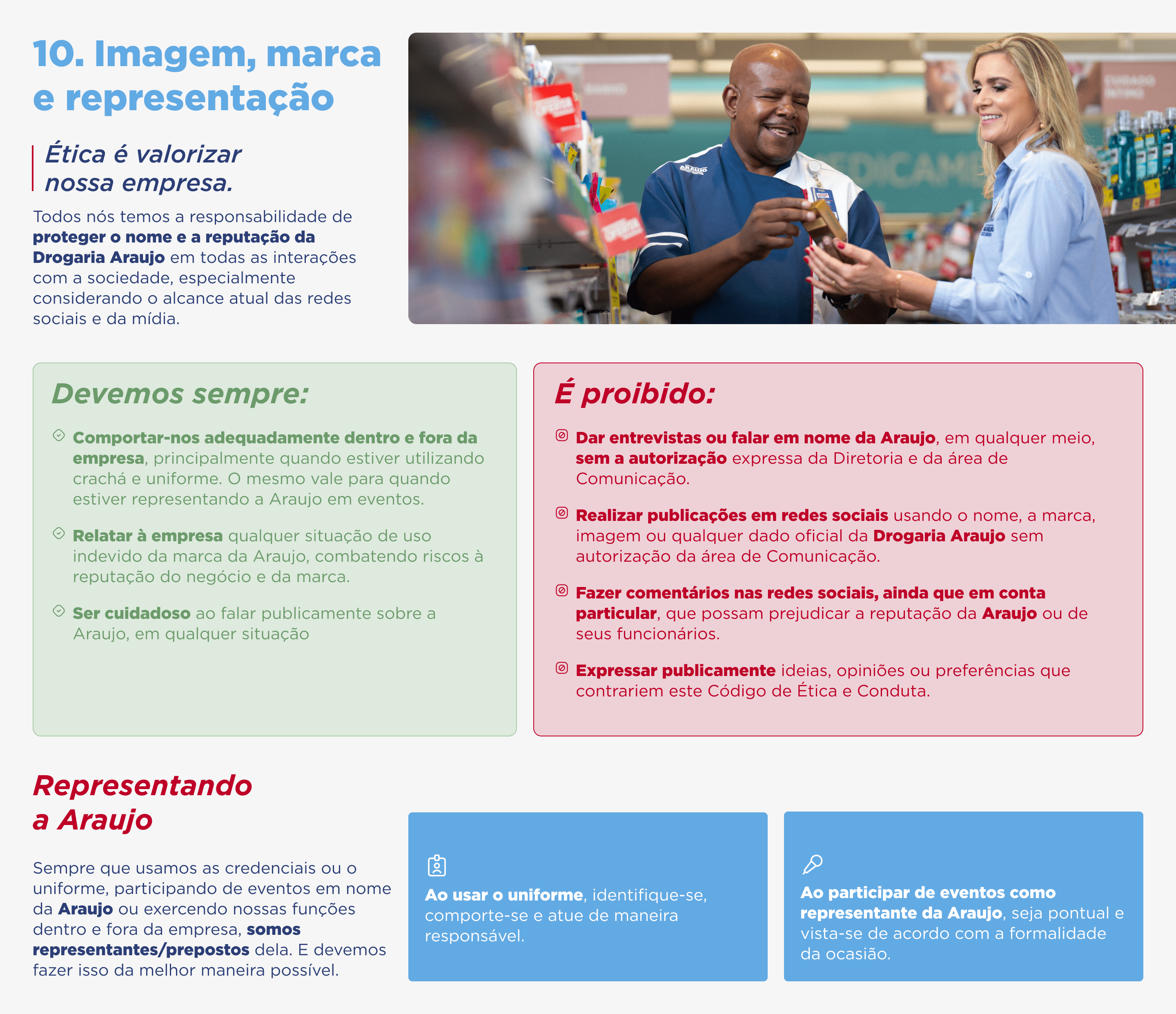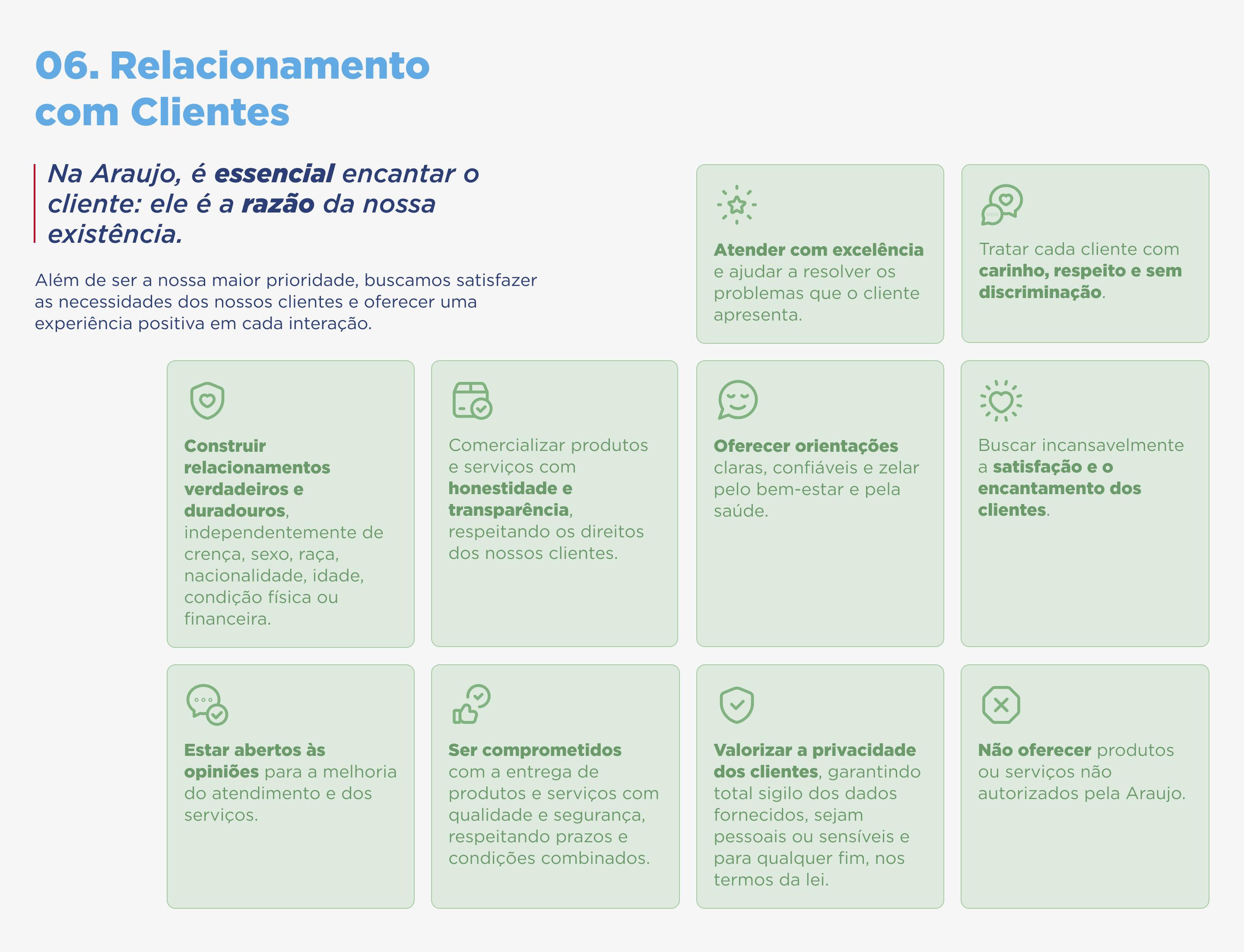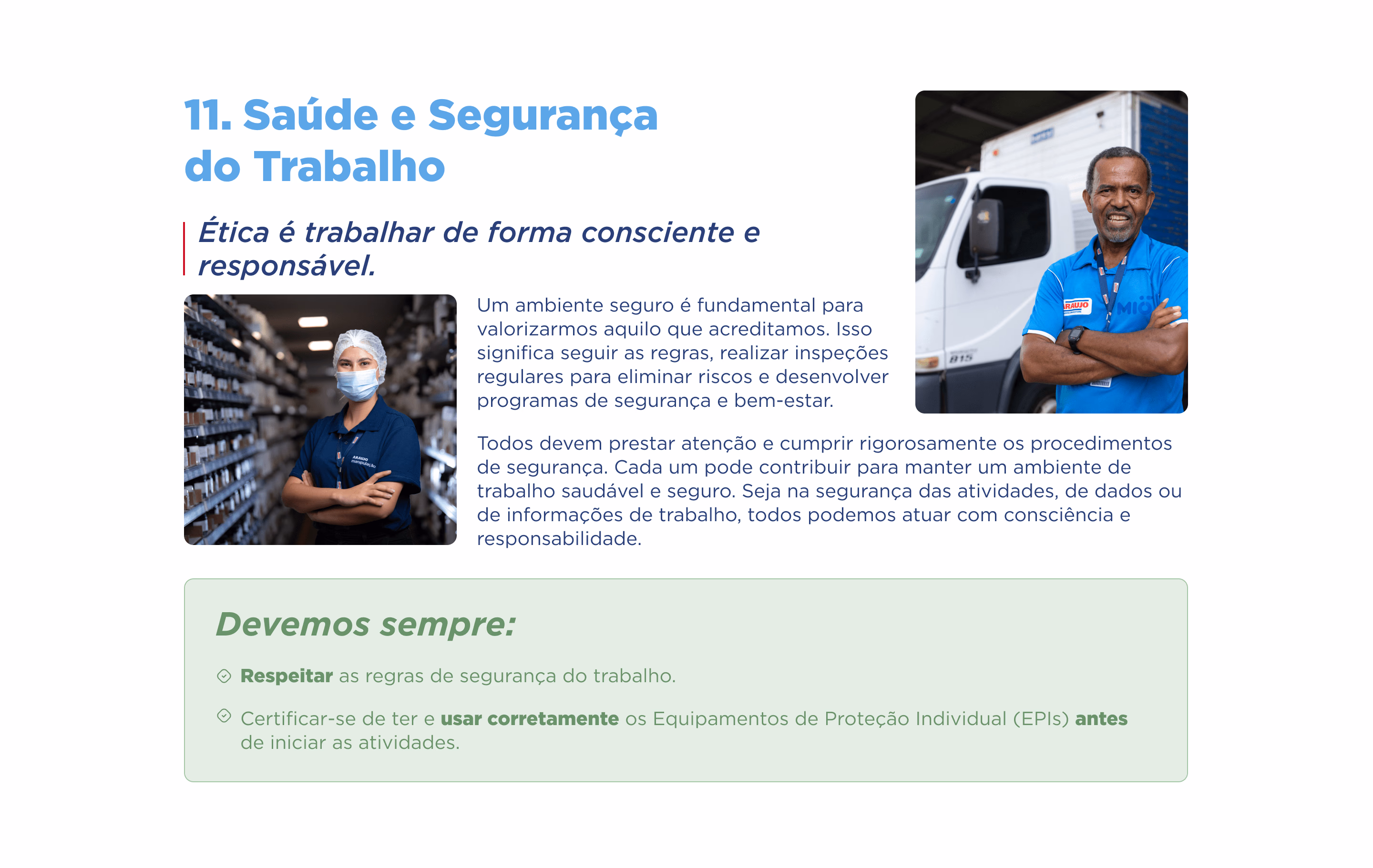 Este Código de Ética e Conduta nasce e evolui continuamente como resultado da reflexão de que somos feitos de pessoas e que a maneira de trabalhar e agir de cada um faz da Araujo a empresa que somos e que queremos ser, todos os dias.