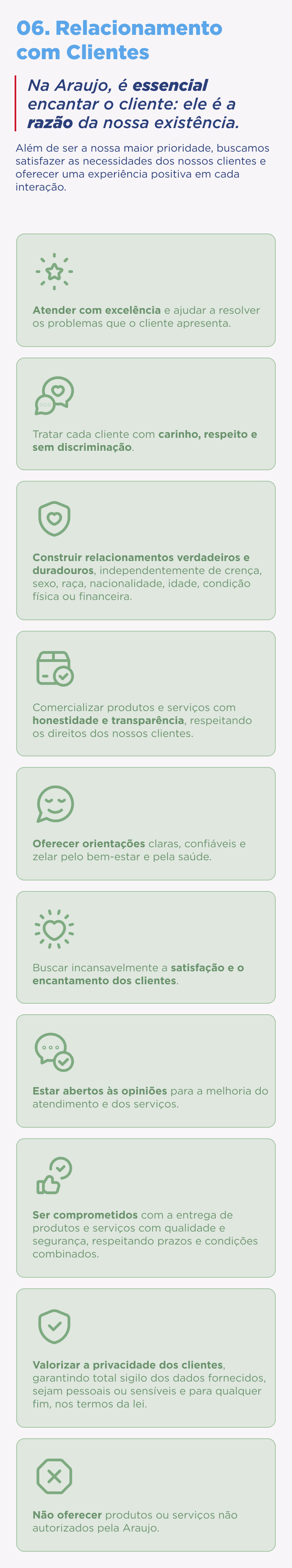 Mais do que conhecer, convidamos você a abraçar e vivenciar o Código de Ética e Conduta – para multiplicar essa atitude positiva, nobre e tão bonita, que tem tudo a ver com aquilo em que acreditamos: cuidar e fazer o bem, com seriedade, confiança, convicção e amor. Fazer o certo, do jeito certo, sempre.
