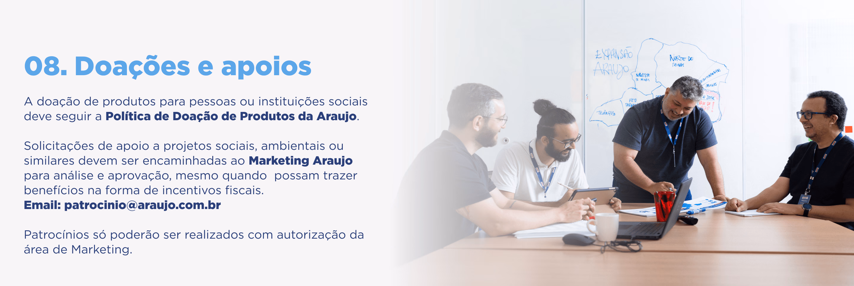 Este Código de Ética e Conduta se aplica, sem exceção, a todos os colaboradores, acionistas, parceiros e pessoas que mantenham relacionamento com a Araujo.