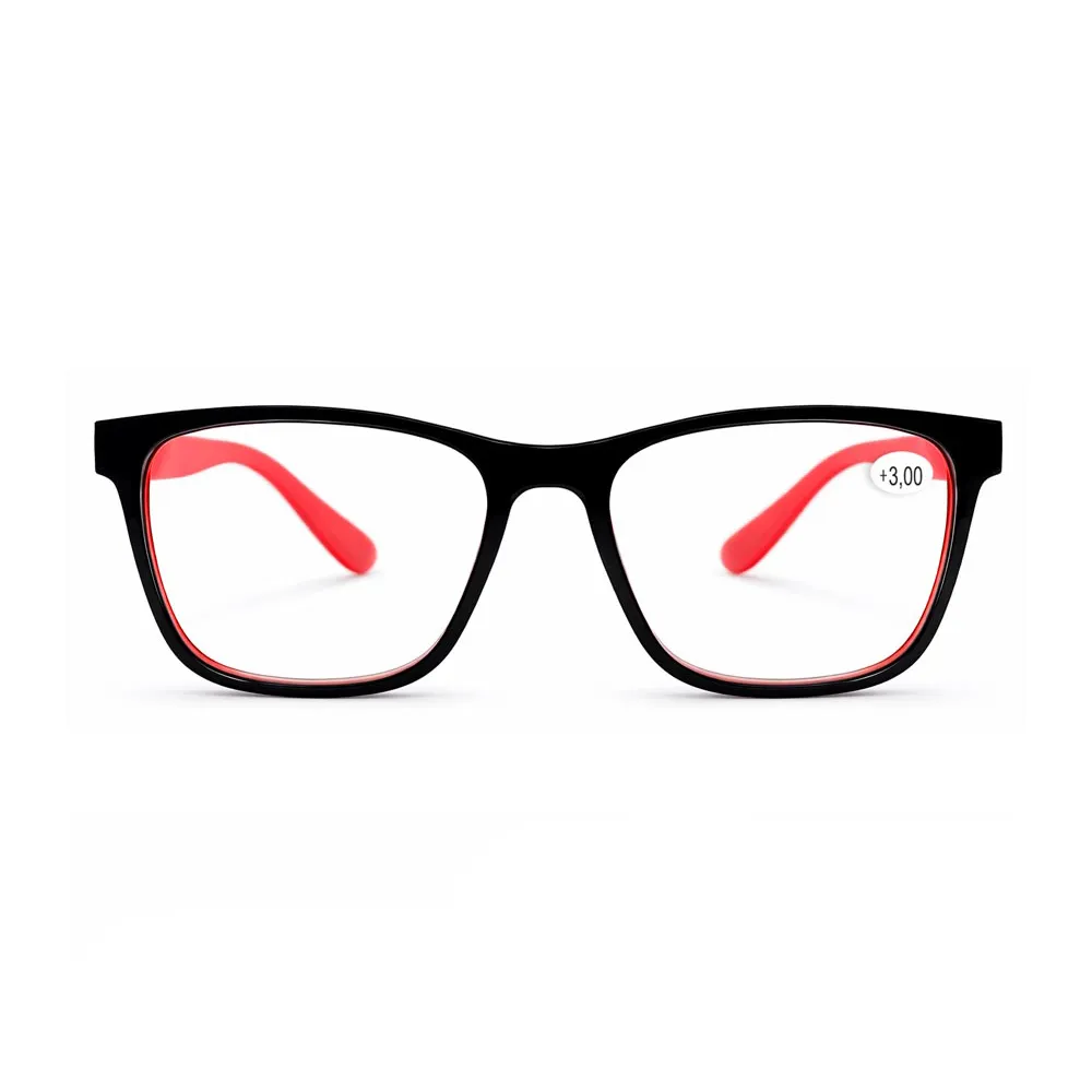 Título do Produto Óculos Lupa para Leitura MIÓ Grau +3,00 – Armação Bicolor Preto e Vermelho
