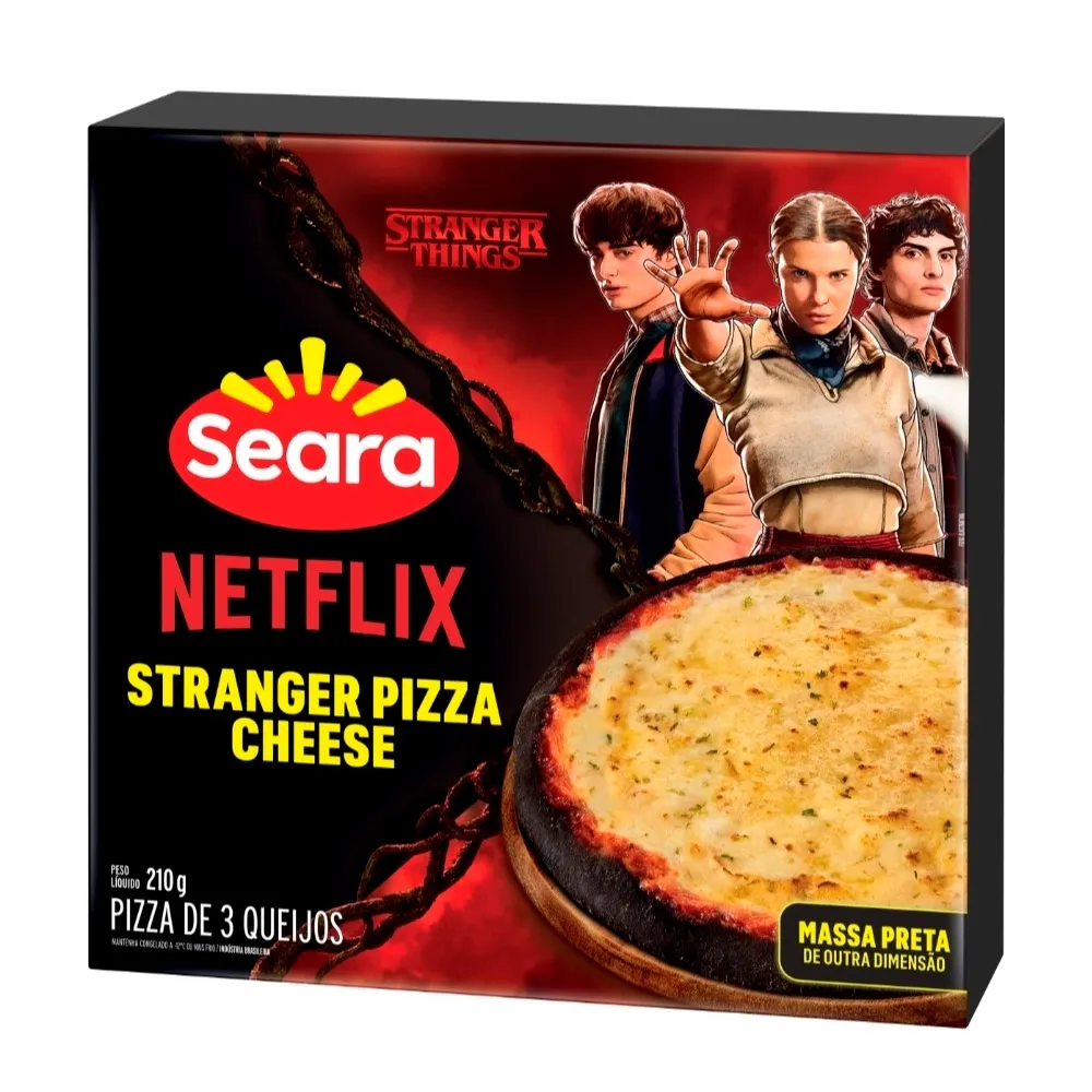 Para quem prefere o clássico sabor do queijo, a Seara e a Netflix trouxeram uma versão sobrenatural. A Stranger Pizza Cheese une a cremosidade irresistível de três queijos com a inovadora Massa Preta, criando um visual único e um sabor inesquecível.