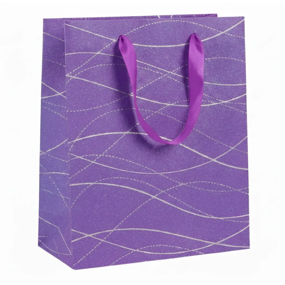 Fabricada em papel resistente de alta gramatura, a sacola apresenta uma estampa moderna com linhas onduladas e detalhes em glitter/prata, que conferem um brilho sutil e refinado. Suas alças de cetim na cor da sacola não apenas garantem conforto e segurança no transporte, mas adicionam um toque de classe e acabamento premium.