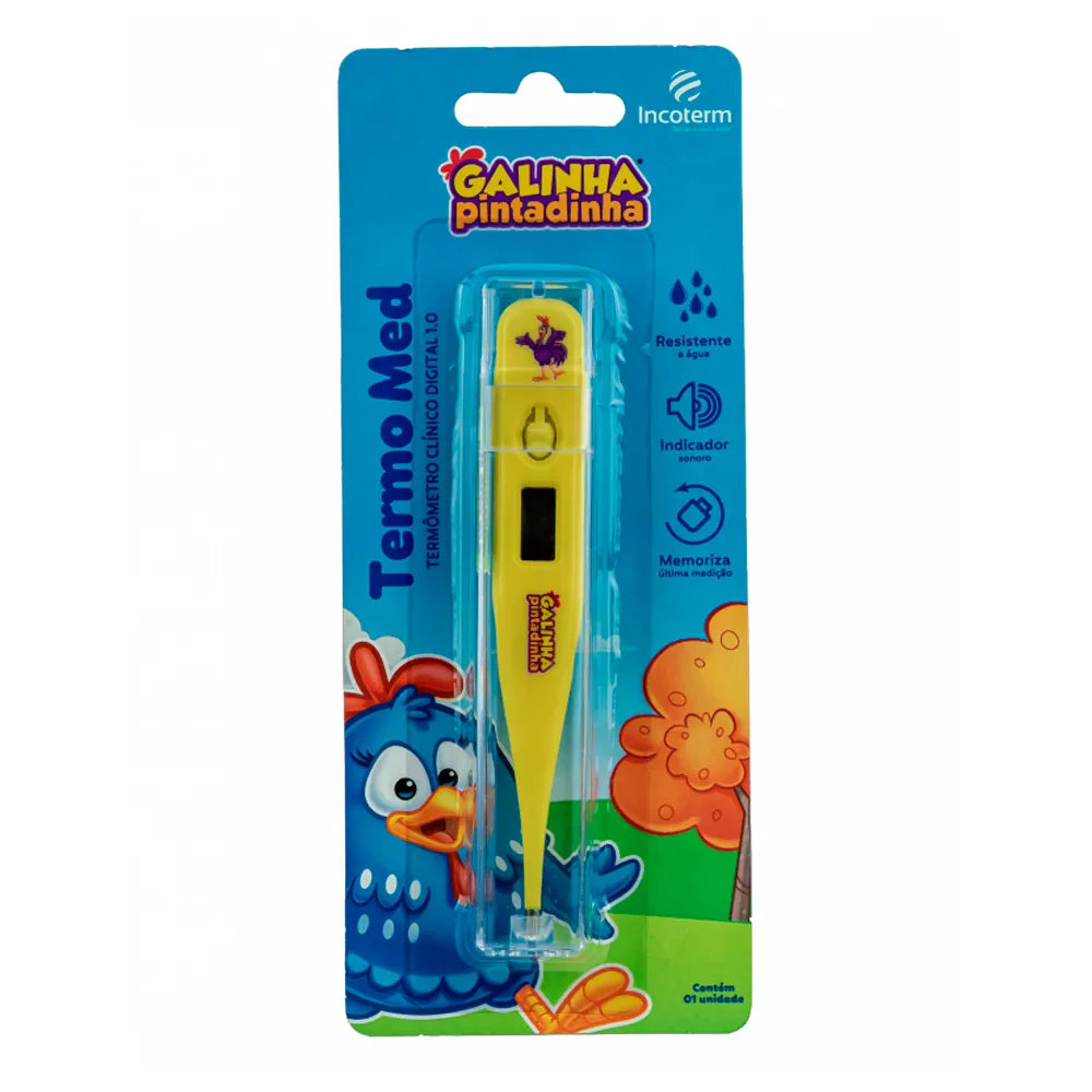 O Termômetro Clínico Digital Termomed Galinha Pintadinha é um produto verificado e aprovado pelo INMETRO com precisão e qualidade comprovada. Produto de fácil utilização, durável e com resultados confiáveis. É à prova d’água, possui indicador sonoro com alertas diferenciados para temperatura normal e febril, sua tomada de temperatura é cerca de 1 minuto.