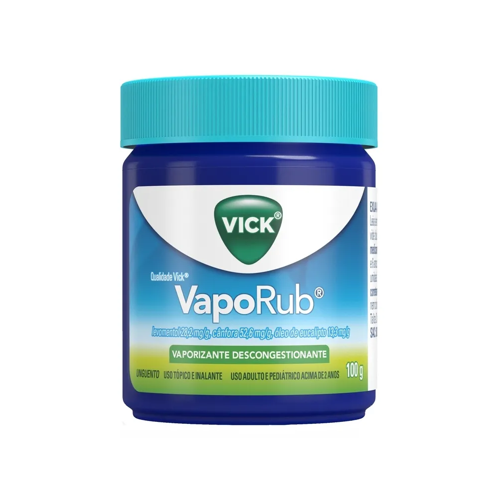 Vick VapoRub é uma pomada que combina mentol, óleo de eucalipto e cânfora e ajuda a aliviar alguns sintomas de constipação como congestão nasal, tosse e dores musculares. Vick VapoRub proporciona alívio da congestão nasal em 2 minutos por até 8 horas, para uma boa noite de sono. Vick VapoRub pode ser aplicado no pescoço (para aliviar a tosse), peito (para ajudar a limpar as vias aéreas) e costas (para aliviar as dores musculares e as dores de um resfriado).Não usar em crianças com menos de 2 anos de idade. •Alivia alguns sintomas da gripe •Alivia a tosse•Alívio de dores musculares próprias da gripe e resfriados•Alívio da congestão nasal em 2 minutos por até 8 horas•Alívio de congestão nasal